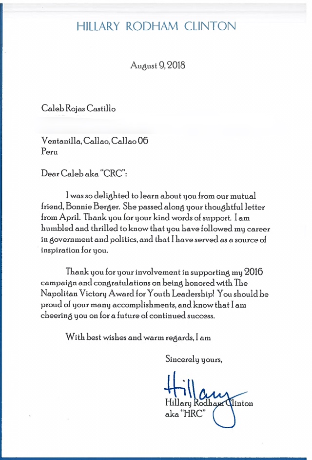 Aprovechando esa amistad en común, le escribió a Hillary y le contó que había obtenido el premio en Washington DC. Para su sorpresa, la noche anterior al inicio del evento, recibió un paquete en su habitación de hotel con la respuesta. En la carta, la excandidata le agradece por el apoyo a su campaña y le felicita por el galardón. Definitivamente, fue una gran noticia para este joven quien durante sus años universitarios impulsó varias iniciativas, estableció convenios y habilitó espacios a favor de los estudiantes.